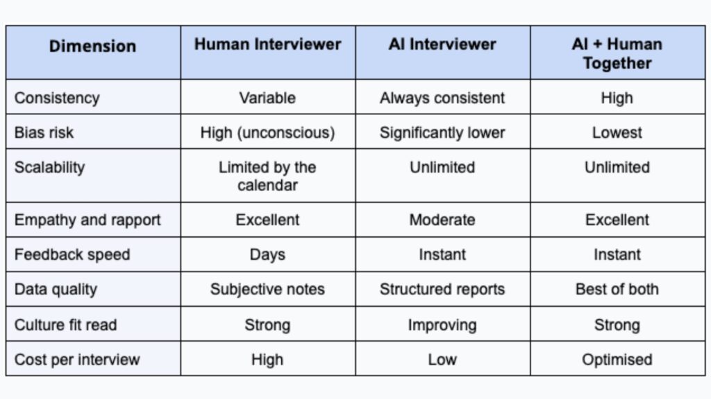 Here is how AI and human interviewers compare across the dimensions that matter most to hiring quality.